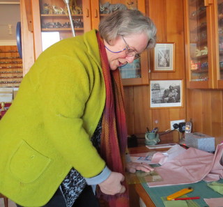 Linda brought along two of her own blue quilts to get advice and hands on help. Note our Brown Roses quilt layout in the background.